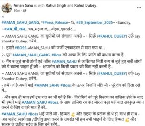 Ranchi : झारखंड के कुख्यात अमन साहू गैंग ने रविवार को सोशल मीडिया के अमन साहू फ़ेसबुक पेज पर प्रेस रिलीज़ जारी कर संगठन की नई कमान का ऐलान किया। अब गैंग का संचालन राहुल दुबे उर्फ जय शंकर दुबे करेगा। गैंग ने अमन साहू की मौत को “फर्जी एनकाउंटर” बताया है। वहीं, संगठन से जुड़े लोगों को आश्वस्त किया गया कि उन्हें किसी तरह की चिंता करने की जरूरत नहीं है। मालूम हो कि अमन साहू ने अपने जीते जी में झारखंड और बिहार में वसूली, रंगदारी और गैंगवार के जरिए आतंक फैलाया था। उसके जाने के बाद भी गैंग अपने नेटवर्क को एक्टिव रखना चाहता है। गैंग की ओर से जारी प्रेस रिलीज में कहा गया है कि राहुल दुबे लंबे समय से अमन साहू के खास रहा है और अब सुप्रीमो के तौर पर संगठन की जिम्मेदारी संभालेगा।