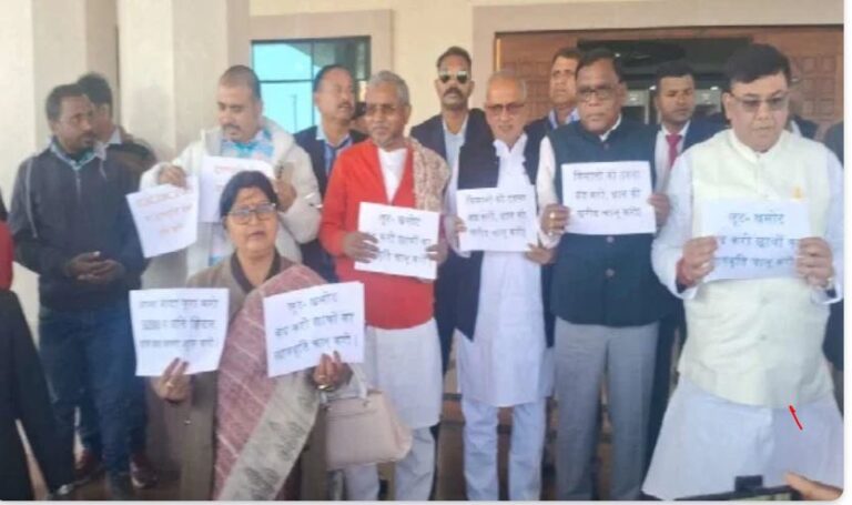 Ranchi : झारखंड विधानसभा के शीतकालीन सत्र के दूसरे दिन सोमवार को विपक्ष ने सरकार के खिलाफ जमकर नारेबाजी की। भारतीय जनता पार्टी (भाजपा), आजसू और लोक जनशक्ति पार्टी (रामविलास) के विधायकों ने हाथों में तख्ती लेकर छात्रवृत्ति भुगतान और धान खरीद के समर्थन मूल्य 3200 रुपये करने सहित विभिन्न मांगों को लेकर प्रदर्शन किया।