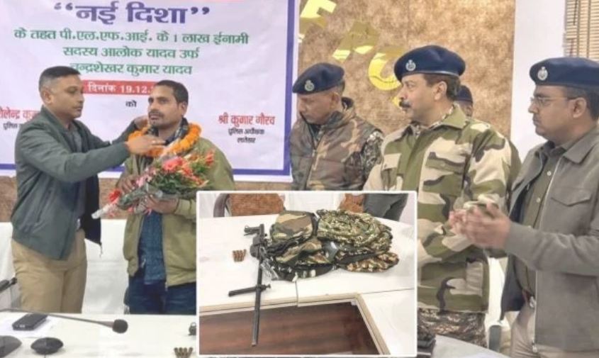 Latehar : PLFI के एक सक्रय उग्रवादी आलोक यादव उर्फ चन्द्रशेखर कुमार यादव ने आज यानी शुक्रवार को सरेंडर कर दिया। उसने लातेहार एसपी कुमार गौरव के दफ्तर में हथियार, गोली और वर्दी के साथ आत्मसमर्पण किया। आत्मसमर्पण के दौरान आलोक यादव ने पुलिस के सामने एक देशी बंदूक, चार जिंदा गोलियां और उग्रवादी संगठन की वर्दी सौंपी। वर्दी में कैमोफ्लाज रंग की शर्ट, पैंट, टी-शर्ट और टोपी शामिल हैं। उसके सरेंडर करने के दरम्यान मौके पर पलामू प्रक्षेत्र के आईजी शैलेंद्र कुमार सिन्हा, लातेहार एसपी कुमार गौरव, एसएसबी 32 बटालियन और सीआरपीएफ 11 बटालियन के कमांडेंट सहित सुरक्षा बलों के वरिष्ठ अधिकारी मौजूद रहे।