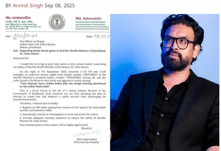 झारखंड…स्वास्थ्य मंत्री इरफान अंसारी को 7 सितंबर की रात एक धमकी भरा कॉल आया। कॉल करने वाले ने उन्हें धमकी दी कि “तुम इंतजार करो, तुम्हें बहुत जल्द उड़ा देंगे… हम लोग झारखंड के लिए निकल चुके हैं।” इस घटना के बाद मंत्री के निजी सचिव अज़हरुद्दीन ने बोकारो स्टील सिटी थाना में लिखित शिकायत दर्ज कराई और तत्काल FIR दर्ज कर कठोर कार्रवाई की मांग की है।शिकायत में अज़हरुद्दीन ने पुलिस से अपील की है कि धमकी देने वाले अज्ञात व्यक्ति के खिलाफ उचित धाराओं में FIR दर्ज की जाए और शीघ्र गिरफ्तारी सुनिश्चित की जाए। साथ ही, मंत्री इरफान अंसारी की सुरक्षा को और सुदृढ़ करने की भी मांग की गई है। अज़हरुद्दीन ने कहा, “मंत्री इरफान अंसारी जनता की सेवा और झारखंड के विकास कार्यों में पूरी निष्ठा से लगे हुए हैं। इस प्रकार की धमकियां कायराना हरकत हैं और इससे न तो मंत्री इरफान अंसारी और न ही हमारी टीम विचलित होगी। हम पूरी घटना की शिकायत पुलिस में दर्ज कर चुके हैं और हमें भरोसा है कि दोषियों पर शीघ्र कड़ी कार्रवाई होगी।” मंत्री इरफान अंसारी ने इस मामले पर कहा कि वह जनता की सेवा और झारखंड के विकास कार्यों से पीछे नहीं हटेंगे और किसी भी प्रकार की धमकियों से भयभीत नहीं होंगे।बता दें कि 7 सितंबर के देर रात लगभग 11:45 बजे से 12 बजे के बीच 7005758247 नंबर से मंत्री इरफ़ान अंसारी को धमकी भरा कॉल आया था। यह पहली बार नहीं जब उन्हें ऐसी धमकियां मिली हो इससे पहले भी उन्हें कॉल करके बम से उड़ाने की धमकी दी थी, जिसे पटना से गिरफ्तार किया गया था।