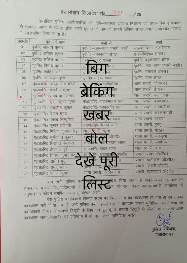 बरही इंस्पेक्टर सह थाना प्रभारी आभास कुमार को साइबर थाना, अनिल कुमार बड़कागांव आंचल से एसटीएफ शाखा, ललित कुमार को एसटीएफ शाखा से बड़कागांव आंचल, विनोद कुमार को पेलावल आंचल से बरही थाना प्रभारी, शाहिद रजा को दारू आंचल से पेलवाल आंचल, जगलाल मुंडा को साइबर थाना से दारू आंचल, पुअनि सरोज सिंह चौधरी को थाना प्रभारी टाटी झरिया से थाना प्रभारी चौपारण, राजदीप कुमार को पुलिस केंद्र हजारीबाग से थाना प्रभारी इचाक, प्रमोद कुमार राय को कनीय अवर निरीक्षक सदर थाना से थाना प्रभारी कटकमदाग, कृष्ण कुमार गुप्ता को कनीय अवर निरीक्षक कटकमदाग थाना से थाना प्रभारी बड़कागांव, इंद्रजीत कुमार को कनीय अवर निरीक्षक बड़कागांव थाना से थाना प्रभारी टाटी झरिया, शिवम गुप्ता को कनीय अवर निरीक्षक बरही थाना से थाना प्रभारी कटकमसांडी, पंकज सिंदुरिया को कनीय अवर निरीक्षक विष्णुगढ़ थाना से थाना प्रभारी बरकट्ठा, कुमार अश्वनी को कनीय अवर निरीक्षक गिद्दी थाना से थाना प्रभारी चूरचू, नितेश कुमार सिंह को थाना प्रभारी चूरचू से थाना प्रभारी गोरहर, सूर्यकांत कुमार को कनीय अवर निरीक्षक पगार ओपी से थाना प्रभारी चलकुशा, निशांत केरकेट्टा को कनीय अवर निरीक्षक कटकमदाग थाना से थाना प्रभारी लोहसिंघना, इकबाल हुसैन को कनीय अवर निरीक्षक सदर थाना से थाना प्रभारी दारू, दिनेश कुमार मंडल को कनीय अवर निरीक्षक बड़ा बाजार से ओपी प्रभारी पगार, सागेन मुर्मू को कनीय अवर निरीक्षक विष्णुगढ़ थाना से थाना प्रभारी डाड़ीकला ओपी प्रभारी, रामकुमार राम को पुलिस केंद्र हजारीबाग से ओपी प्रभारी सिकरी, पंकज कुमार को थाना प्रभारी कटकमदाग से ओपी प्रभारी बड़ाबाजार को बनाया गया है।